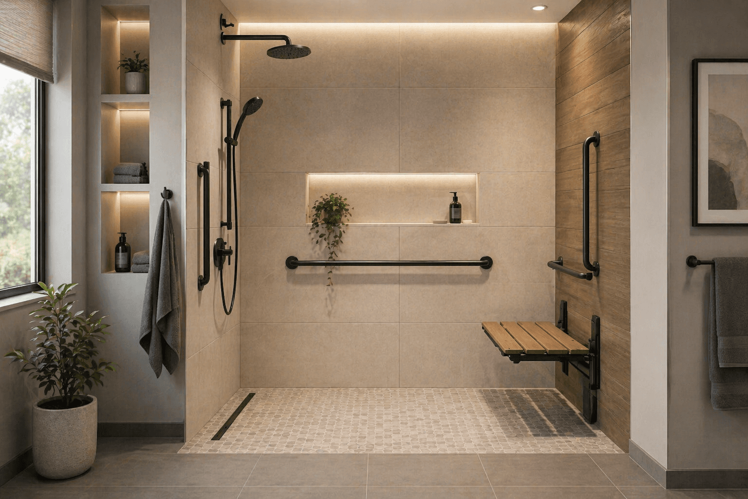 Walk-in showers with zero-threshold entry eliminate the step-over barrier that causes most bathroom falls. We design these to look like intentional design choices, not medical accommodations, with options like fold-down benches, hand-held showerheads, and anti-slip flooring that still looks beautiful.